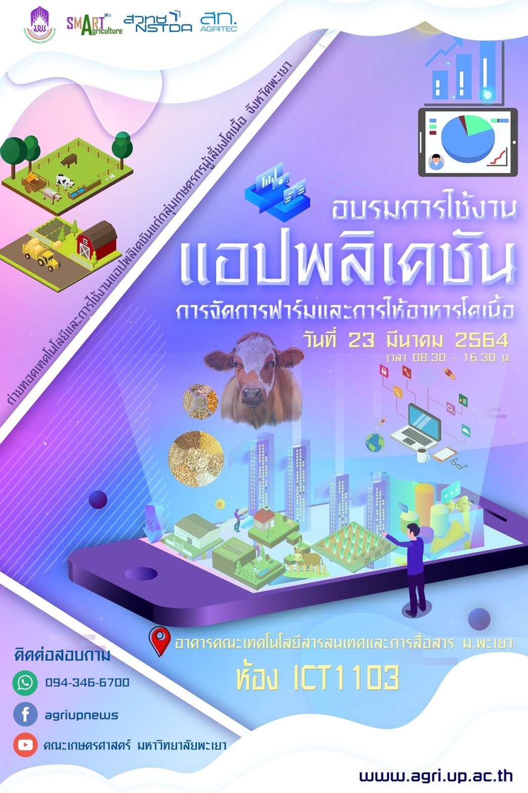 วันที่ 23 มีนาคม 2564 คณะเกษตรศาสตร์และทรัพยากรธรรมชาติ มหาวิทยาลัยพะเยา จัดการอบรม "การใช้งานแอปพลิเคชันการจัดการฟาร์มและการให้อาหารโคเนื้อ" ณ ICT1103 อาคารคณะเทคโนโลยีสารสนเทศและการสื่อสาร มหาวิทยาลัยพะเยา ด้วยความร่วมมือจากสำนักงานพัฒนาวิทยาศาสตร์และเทคโนโลยีแห่งชาติ (สวทช.) และสถาบันการจัดการเทคโนโลยีและนวัตกรรมเกษตร (สท.)