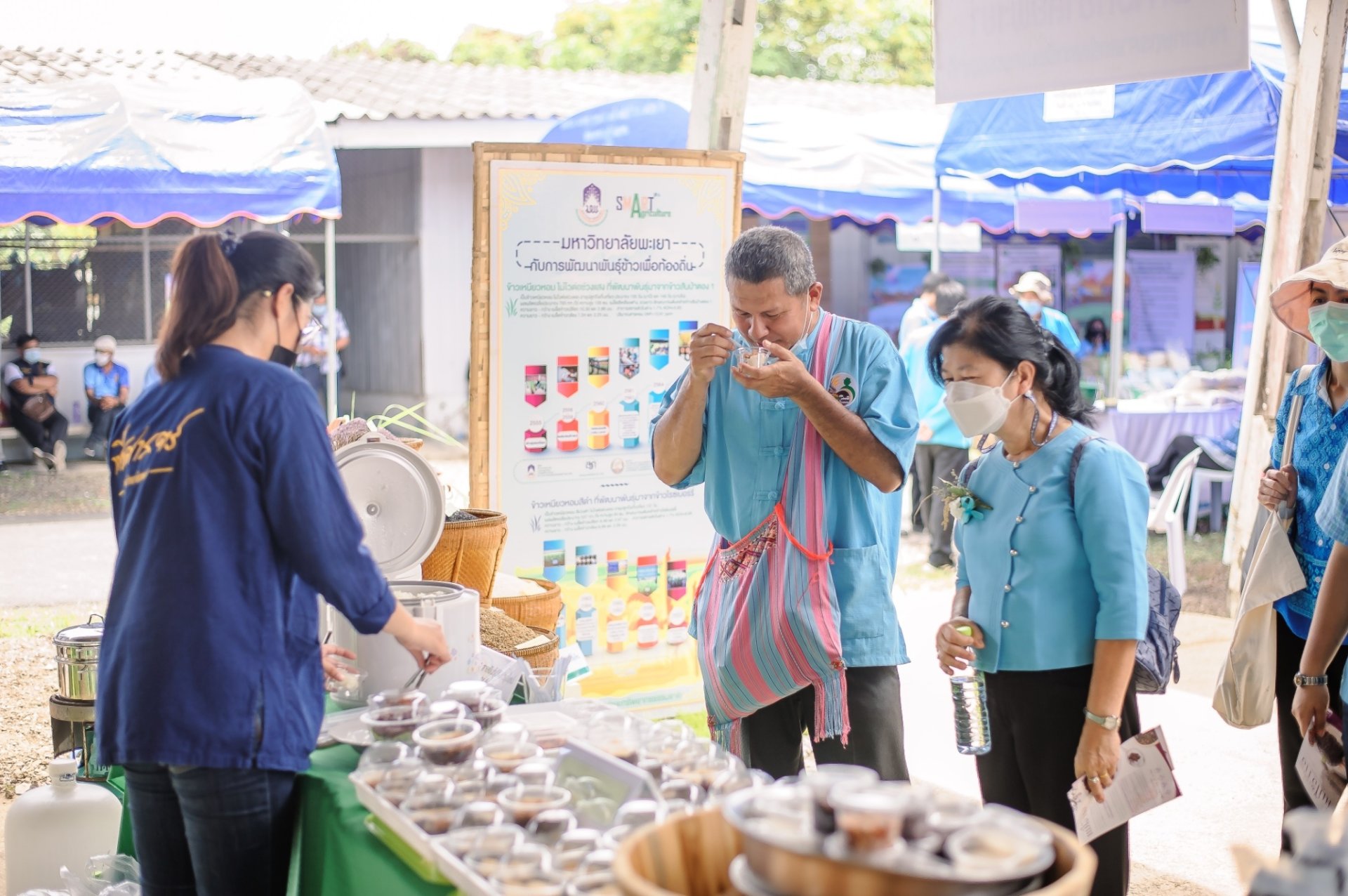ทั้งนี้เป็นการจัดบูธนิทรรศการการถ่ายทอดเทคโนโลยีการผลิตข้าว และนำเสนอผลการดำเนินงาน วิจัย นวัตกรรม กับการพัฒนาพันธุ์ข้าวของมหาวิทยาลัยพะเยา อยู่ 2 สายพันธุ์ คือ 1.ข้าวเหนียวหอม ไม่ไวต่อช่วงแสง ที่พัฒนามาจากข้าวสันป่าตอง 1, 2.ข้าวเหนียวหอมสีดำ ที่พัฒนาพันธุ์มาจากข้าวไรซ์เบอร์รี่ ซึ่งภายในงานมีกิจกรรมต่าง ๆ มากมายอาทิเช่น การเสวนาเรื่อง " ทางเลือกและทางรอดของชาวนาภาคเหนือ " " ชาวนาจะปรับตัวอยู่รอดได้อย่างไร เมื่อปัจจัยการผลิตแพง ", ขบวนแห่พระแม่โพสพ, พิธีปล่อยกบลงนาปล่อยปลาลงหนอง, พิธีแฮกนา(แรกนาขวัญ) และพิธีสู่ขวัญควาย