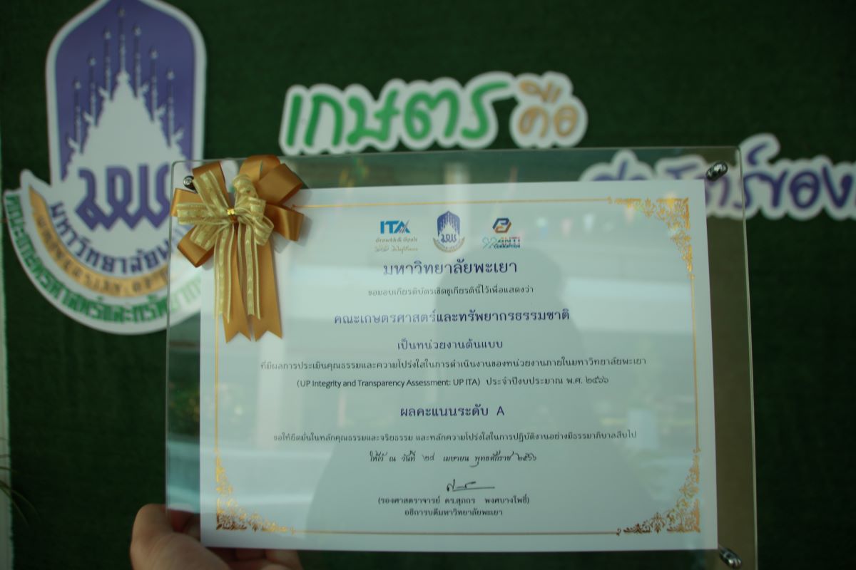 ในการประชุมดังกล่าว คณะเกษตรศาสตร์และทรัพยากรธรรมชาติ ได้เข้ารับมอบเกียรติบัตรเชิดชูเกียรติ หน่วยงานต้นแบบโดนเด่น ที่มีผลการประเมินคุณธรรมและความโปร่งใสในการดำเนินงานของหน่วยงานภายในมหาวิทยาลัยพะเยา (UP Integrity and Transparency Assessment: UP ITA) ประจำปีงบประมาณ พ.ศ. 2566 ระดับ A จากรองศาสตราจารย์ ดร.สุภกร พงศบางโพธิ์ อธิการบดีมหาวิทยาลัยพะเยา ผ่านการเข้าร่วม ระบบการประเมินคุณธรรมและความโปร่งใสในการดำเนินงานของหน่วยงานภายในมหาวิทยาลัยพะเยา (UP ITA) ประจำปีงบประมาณ พ.ศ. 2566 อันประกอบด้วย การประเมินผลทั้งหมด 3 ส่วน ได้แก่ การวัดการรับรู้ผู้มีส่วนได้ส่วนเสียภายใน (IIT) การวัดการรับรู้ผู้มีส่วนได้ส่วนเสียภายนอก (EIT) และการวัดการเปิดเผยข้อมูลสาธารณะ (OIT ) ตามเกณฑ์การประเมินของสำนักงานคณะกรรมการป้องกันและปราบปรามการทุจริตแห่งชาติ (สำนักงาน ป.ป.ช.)
