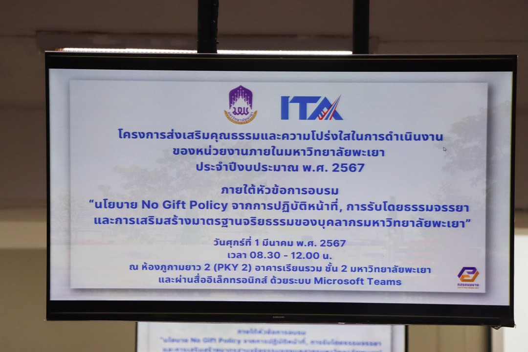 เรื่อง “สาระสำคัญของการเสริมสร้างมาตรฐานทางจริยธรรมแก่ผู้บริหารและบุคลากรของมหาวิทยาลัยพะเยา ที่สอดคล้องตามกรอบหลักเกณฑ์ทางกฎหมายที่เกี่ยวข้อง ได้แก่ รัฐธรรมนูญแห่งราชอาณาจักรไทย พุทธศักราช 2560 มาตรา 76, พระราชบัญญัติมาตรฐานทางจริยธรรม พ.ศ. 2562 มาตรา 5, ระเบียบสำนักนายกรัฐมนตรีว่าด้วยการให้หรือรับของขวัญของเจ้าหน้าที่ของรัฐ พ.ศ. 2565 ข้อ 5 - 8, ข้อ 18 – 19 และระเบียบสำนักนายกรัฐมนตรีว่าด้วยการเรี่ยไรของหน่วยงานของรัฐ พ.ศ. 2562 ข้อ 6 และข้อ 18 - 19