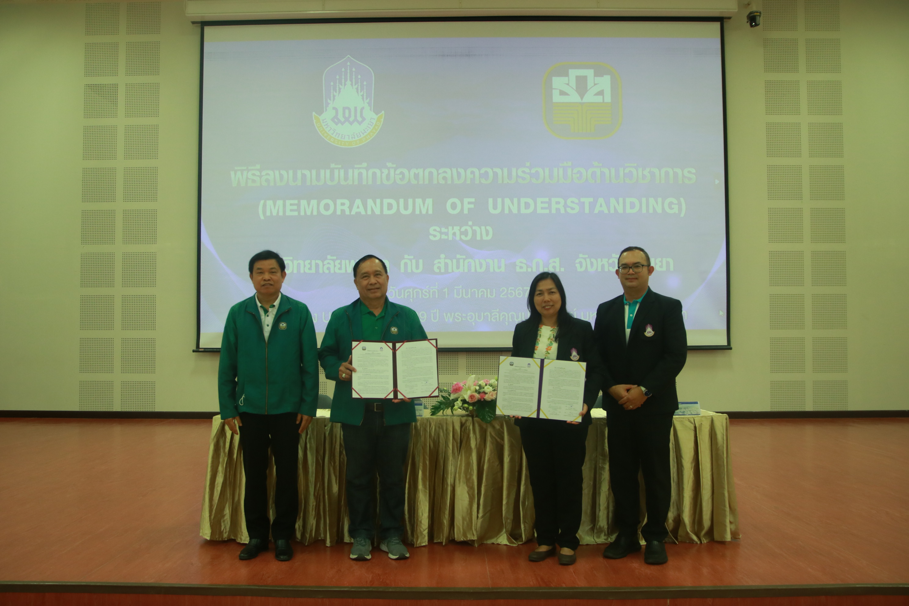 ในวันที่ 1 มีนาคม 2567 คณะเกษตรศาสตร์และทรัพยากรธรรมชาติ มหาวิทยาลัยพะเยา ทำบันทึกข้อตกลงความร่วมมือด้านการบริการวิชาการ(MOU) กับ วิสาหกิจชุมชนสวนเห็ดภูกามยาว ณ UB005 อาคาร 99 ปี พระอุบาลีคุณูปมาจารย์ มหาวิทยาลัยพะเยา นำโดยคณบดี ผศ.ดร.วิพรพรรณ์ เนื่องเม็ก, รองคณบดี, คณาจารย์, พร้อมบุคลากร ให้การต้อนรับสำนักงาน ธ.ก.ส. จังหวัดพะเยา นำโดยนายกลศาสตร์ เรืองแสน ผู้อำนวยการสำนักงาน ธ.ก.ส. จังหวัดพะเยา เป็นผู้มีอำนาจลงนาม