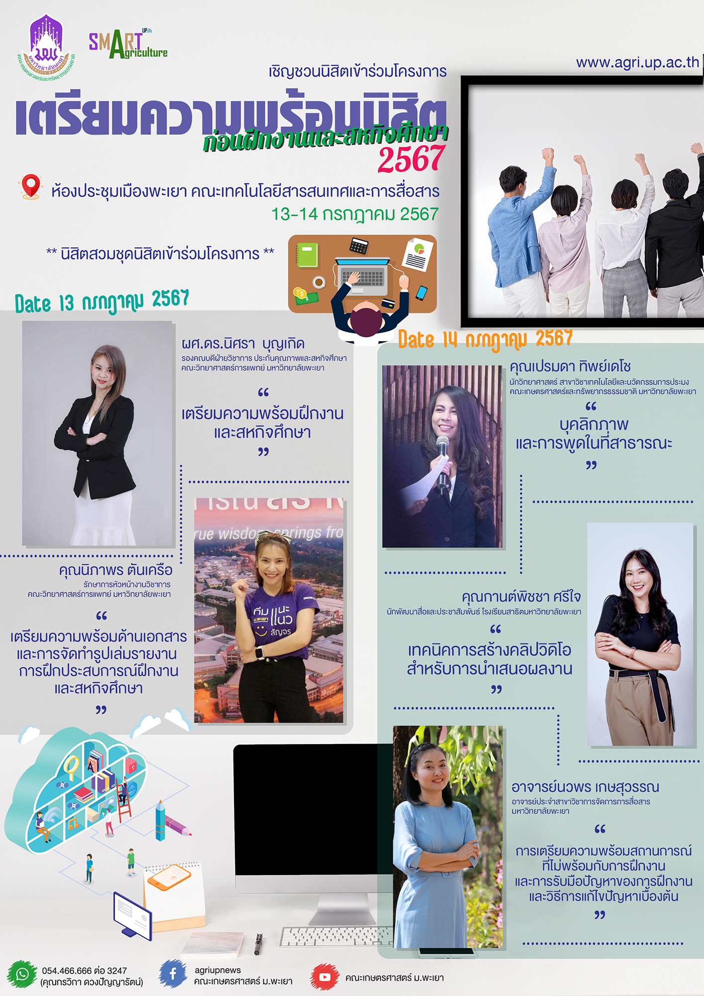 ในระหว่างวันที่ 13-14 กรกฏาคม 2567 คณะเกษตรศาสตร์และทรัพยากรธรรมชาติ มหาวิทยาลัยพะเยา จัดกิจกรรม "โครงการเตรียมความพร้อมนิสิตก่อนฝึกงานและสหกิจศึกษา" ณ ห้องประชุมเมืองพะเยา อาคารคณะเทคโนโลยีสารสนเทศและการสื่อสาร มหาวิทยาลัยพะเยา ให้กับนิสิตคณะเกษตรศาสตร์และทรัพยากรธรรมชาติ ชั้นปีที่ 3-4 จำนวน 219 คน