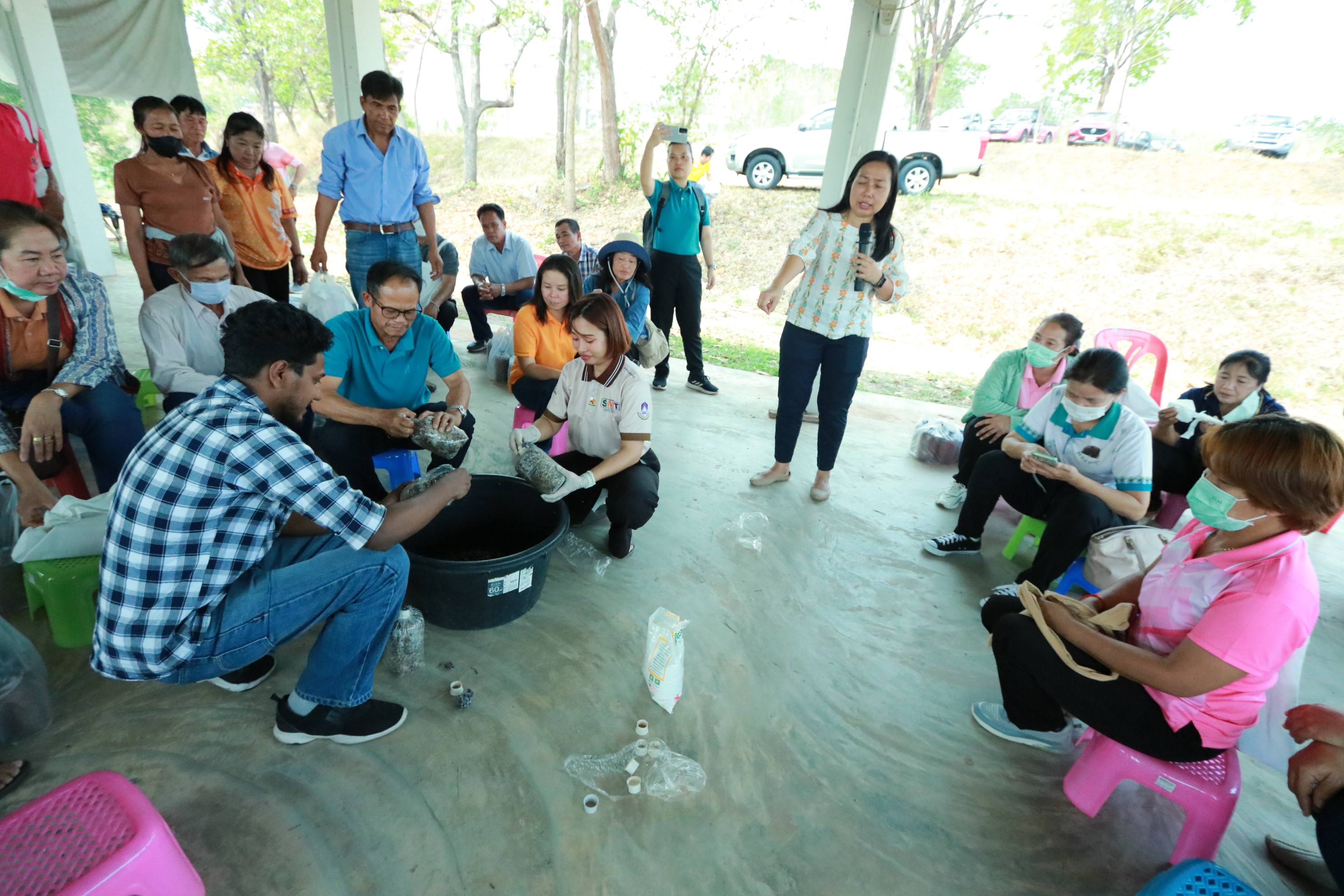 การเพาะเห็ดก้อนแบบประยุกต์ ซึ่งสามารถนำวัสดุเหลือใช้มาใช้ประโยชน์ในการเพาะเห็ดเพื่อสร้างรายได้เสริมในครัวเรือน โดยมีการสาธิตขั้นตอนการผสมวัสดุ การนึ่ง การบรรจุถุง และการดูแลรักษา