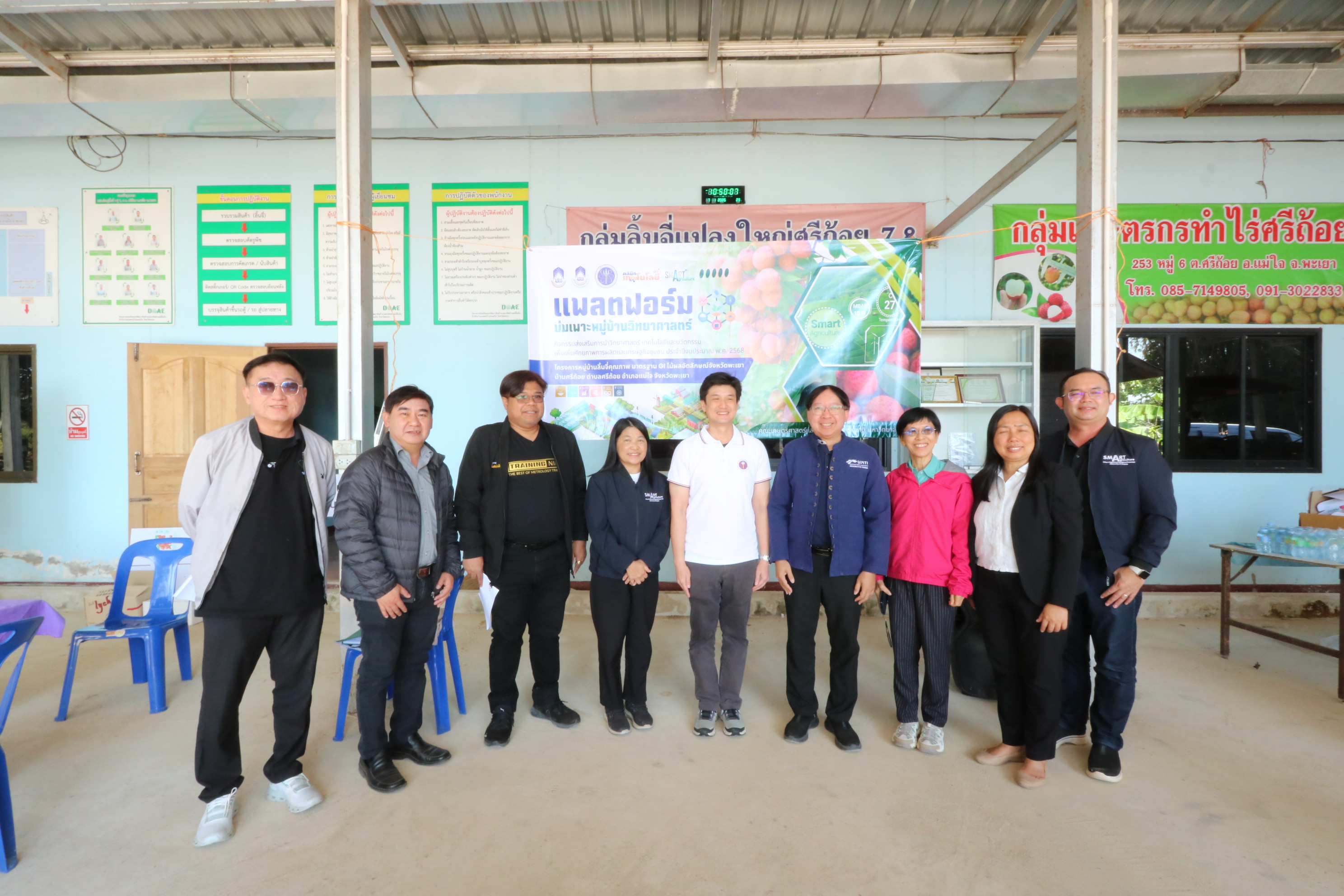 The project, located in Ban Sri Thoi, Mae Chai District, Phayao, focuses on the Geographical Indication (GI) Lychee, a signature identity fruit of the province. The delegation was led by Asst. Prof. Dr. Wipornpan Nuengmek (Dean), Dr. Boonruam Kidka (Associate Dean for Policy and Organizational Development), and Asst. Prof. Dr. Wasana Phitakpol, alongside the research team and staff.