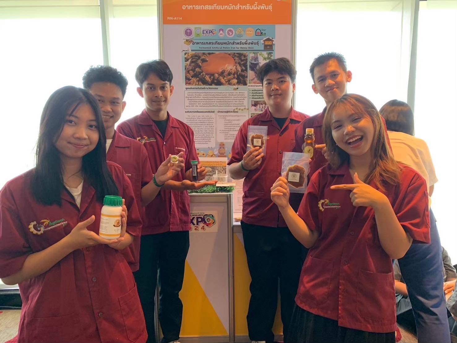 This initiative has already yielded significant results. For instance, two second-year students, Ms. Vorakamon Ruealom and Ms. Natthaporn Koktrakun, have co-authored research papers currently under review for publication in international journals (SCOPUS Q2 and Q3) in 2024. Additionally, one utility patent application has been submitted. Another student, Mr. Chokwiwat Singharit, a third-year student and team leader, has further developed the advisor’s research to formulate a low-cost feed priced at an average of 80 THB per kilogram. The feed contains no less than 10% protein, 30% sugar, and 5% fat. This feed has proven effective in supporting honey bee colonies during periods of food scarcity, reducing the cost of commercial supplements by 24.87%. The innovation was awarded a silver medal at the Thailand Research Expo 2024.