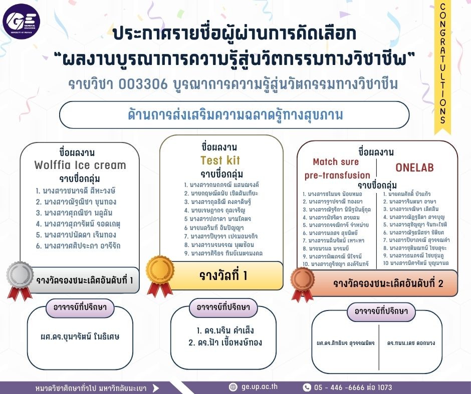 The School of Agriculture and Natural Resources, University of Phayao, proudly congratulates undergraduate students from the Food Safety Program who received two prestigious awards for their integrated knowledge and professional innovation project titled “Wolffia Ice Cream”. The project focuses on creating an innovative health product using Wolffia, a nutrient-rich aquatic plant, as the main ingredient.